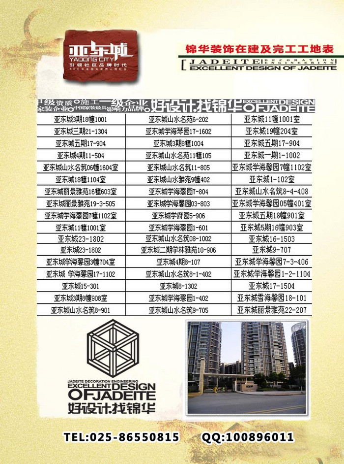 為了更好的讓亞東城的業(yè)主了解錦華裝飾的整個工藝流程,錦華裝飾仙林片區(qū)分公司整理了所有亞東城的完工及在建工地,歡迎大家來參觀。
