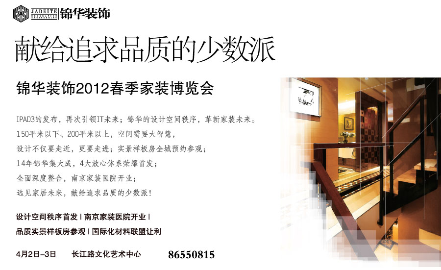 樣板房戶型設(shè)計(jì)、工地大開(kāi)放 全南京1000套樓盤(pán)(2011-2013)規(guī)劃設(shè)計(jì)方案,主力戶型配備3種方案規(guī)劃,想您所想。 雅居樂(lè)、天正湖濱等精裝樣板房整裝以待,等待您的檢驗(yàn)。 設(shè)計(jì)空間次序?qū)僖?guī)劃、四大放心體系榮譽(yù)首發(fā)、讓您不虛此行! 。家裝顧問(wèn)全程陪同引領(lǐng),設(shè)計(jì)施工材料一場(chǎng)展會(huì)全看遍。設(shè)計(jì)師一對(duì)一講解定制方案,把家交給我們,請(qǐng)您放心!
