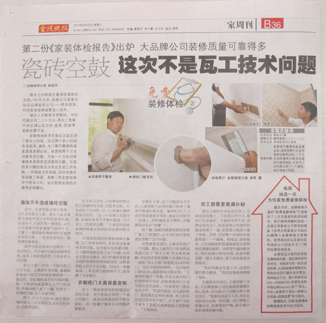 近日,南京知名媒體“金陵晚報”開通了“裝修體檢直通車”服務(wù),邀請廣大正在裝修中的業(yè)主報名,金陵晚報將和驗房專家一起走進(jìn)業(yè)主家,驗房后出具《家裝體檢報告》,幫助業(yè)主發(fā)現(xiàn)問題并解決問題。