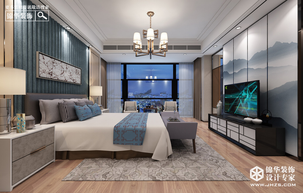 主臥并沒有因為自己是主人而特立獨行,它將藍色的主色調進行到底,主臥與衣帽間之間采用定制的中式水墨畫作為隔斷,門采用的是麻紗設計,讓整個空間既統(tǒng)一,又更加通透。